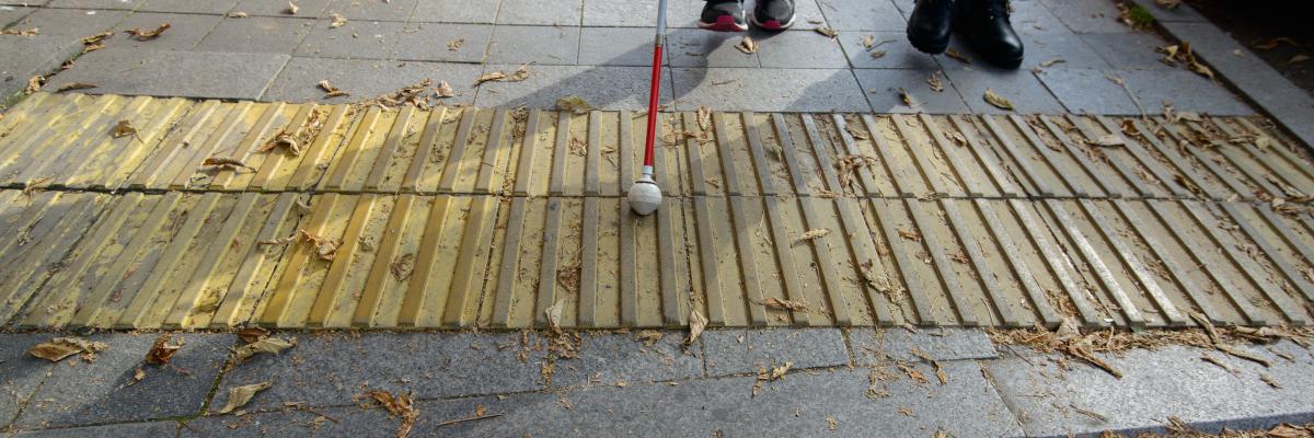 A white cane with a rolling ball tip scans tactile paving on a sidewalk.