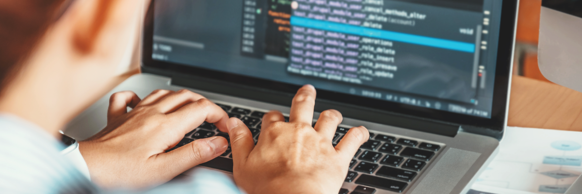 A person types on a laptop. The photo is taken from over their shoulder, and their laptop screen shows lines of code, suggesting that they are engaged in programming or coding.