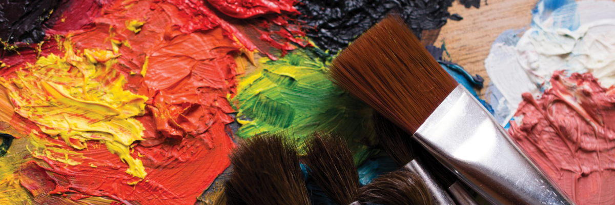 A colourful hand-painted mural with various paintbrushes lying on top of the mural. The abstract mural has thick, textured paint in vibrant colours like red, yellow and green.