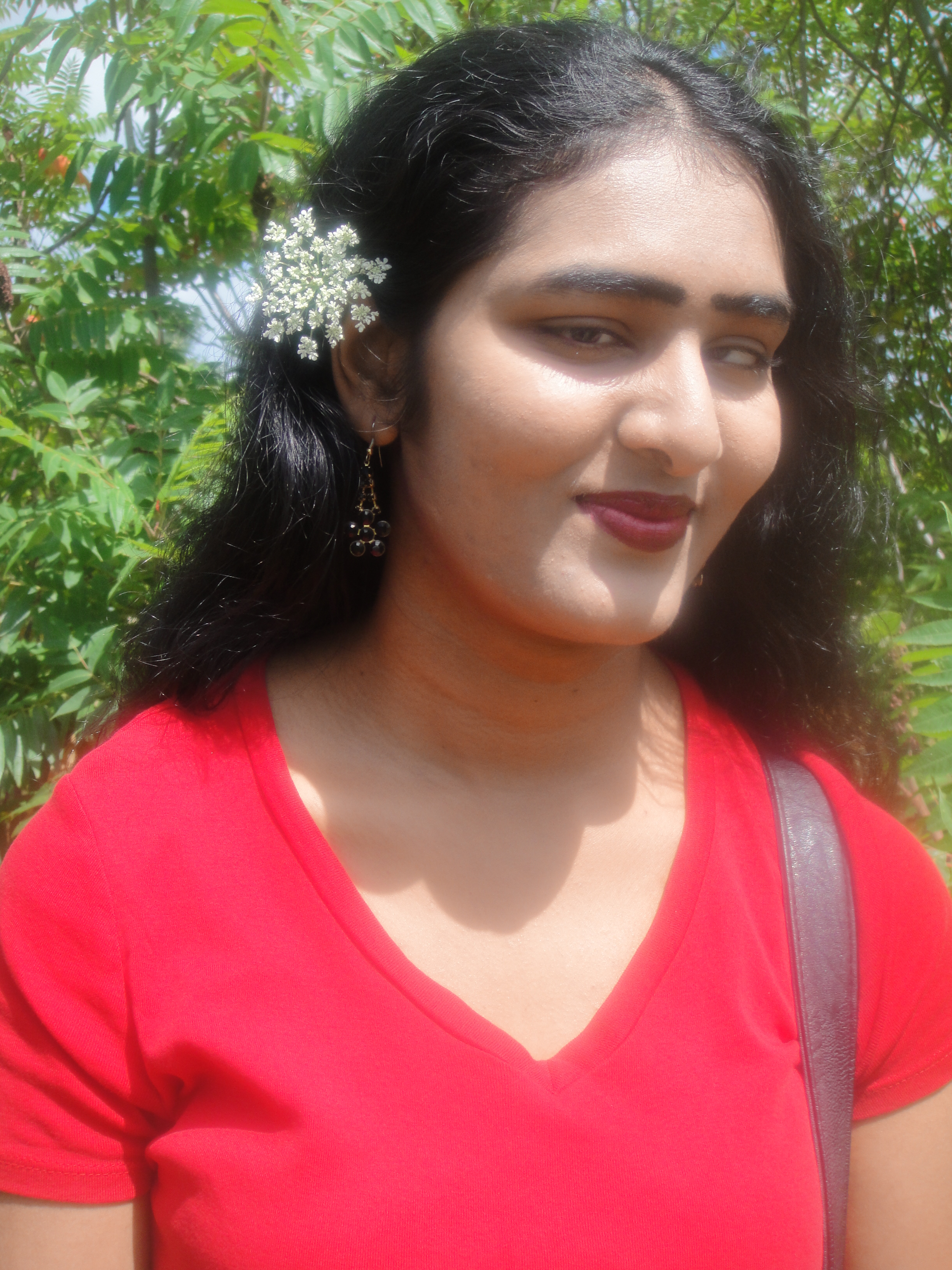 Headshot of Kamini, who is smiling and wearing a red v-neck top and a white flower in her hair.