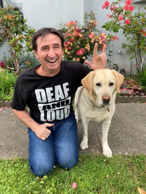 Eddy sits in front of a backyard garden with his guide dog. His left-hand hovers above the dog’s head as he signs “I love you” in ASL. The black t-shirt Eddy is wearing has a bold text design that reads “Deaf and loud!” Eddy was born deaf and later experienced a gradual decline in his sight, resulting in total blindness in one eye and some light perception in the other. He communicates using tactile American Sign Language (ASL) and uses a guide dog. A three-time Canadian Paralympic athlete, Eddy is a founding member of the BC Association of the Deafblind and has advocated for various issues faced by the Deafblind community, including transportation, guide dog access, and increased intervenor services.