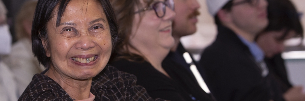 A woman with sight loss looks directly at the camera and smiles. She is sitting amongst a large group of people, who are out of focus in the background.