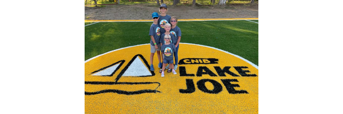 Five children posing on the giant yellow CNIB Lake Joe logo in the middle of the new soccer field. They are all wearing grey CNIB Lake Joe tshirts.