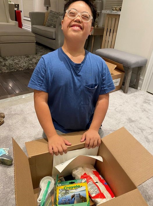 a young camper kneels behind his opened camp box, a huge smile on his faceWe couldn’t bring kids to camp this year, but we could certainly bring camp to the kids!