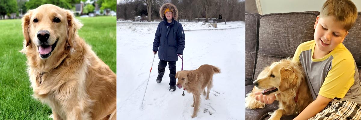 A collage of three photographs. Left: Queenie, a golden retriever. Center: Mason wearing a blue parka standing out in the snow, holding Queenie’s leash with his left hand, and his white cane in his right hand. Right. Mason sitting on the sofa cuddling Queenie, a golden retriever.