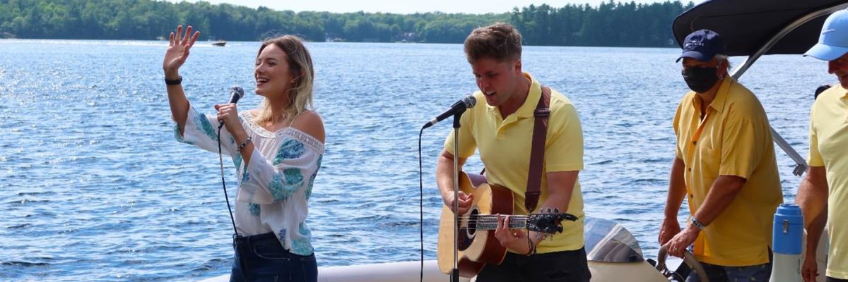 Leah Daniels singing and waving with Will Hebbes beside her playing guitar on a party pontoon, entertaining docks guests on Lake Muskoka.