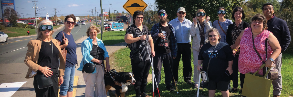 A group of people with sight loss stand next to a pedestrian crossover with public officials in Moncton during the Fall 2023 Get on Board campaign.