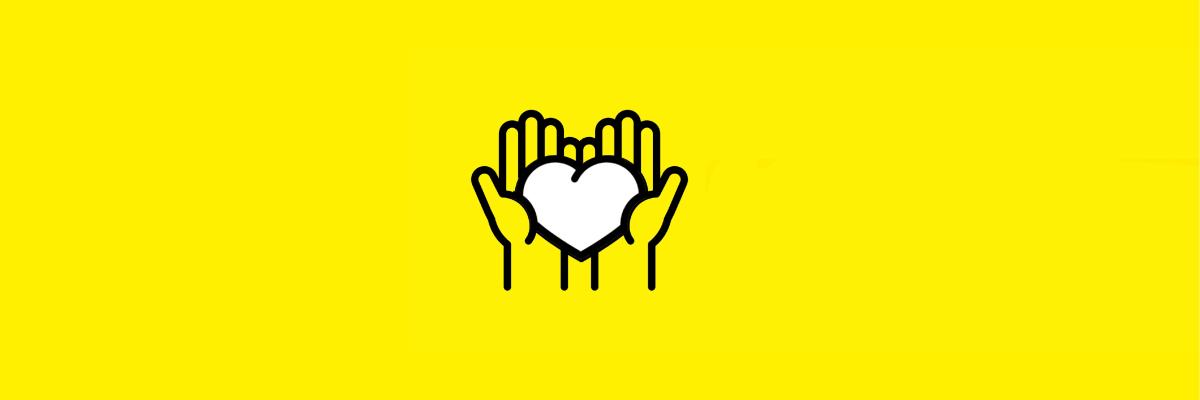 A yellow graphic of hands holding a white heart outlined in black.