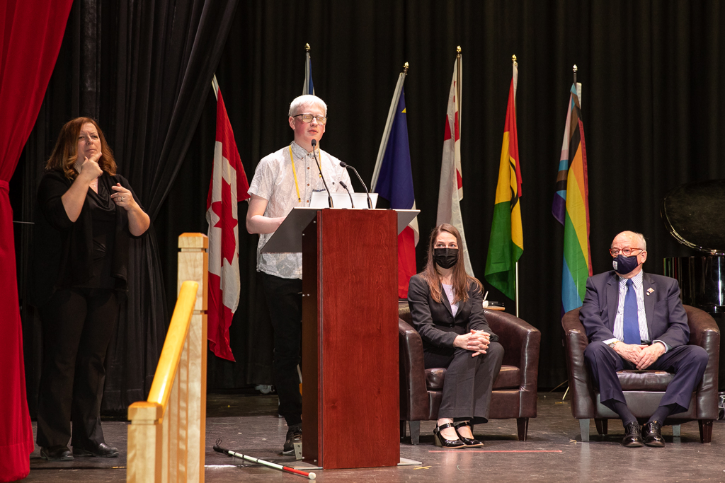 Caelin speaks at the Nova Scotia Education Week Awards ceremony with Hon. Arthur J. Leblanc and Hon. Minister Becky Druhan.