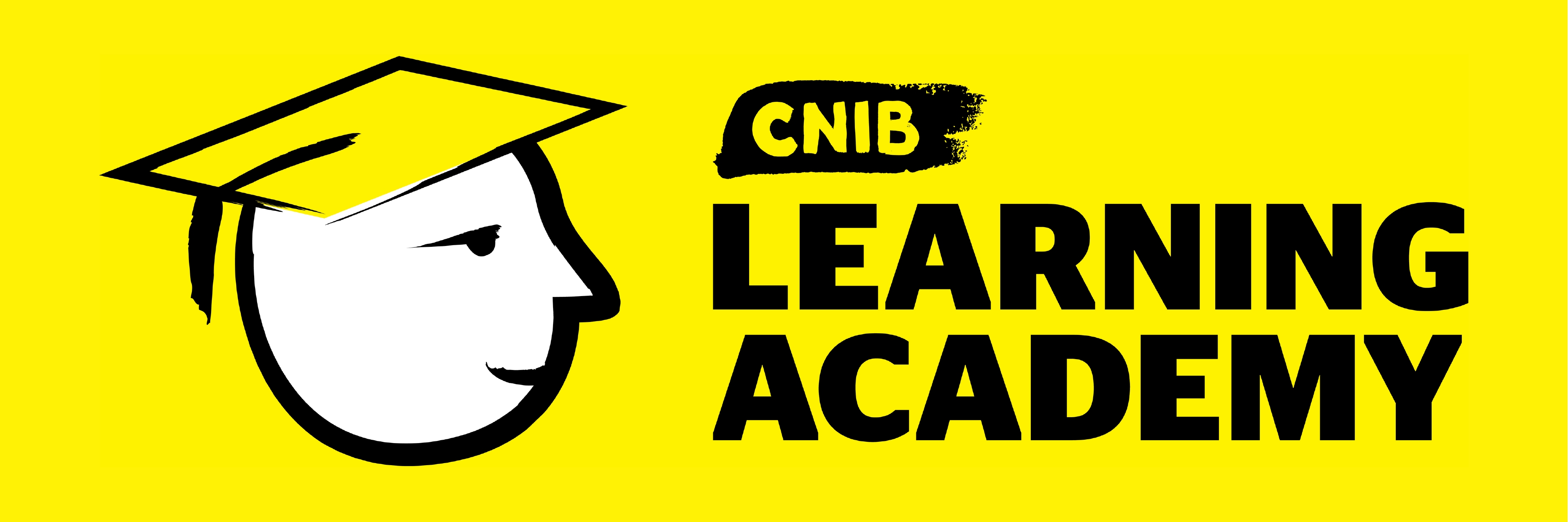 CNIB Learning Academy logo. A graphic-art illustration of a smiling face/icon wearing a graduation cap with white accents. Text: CNIB Learning Academy