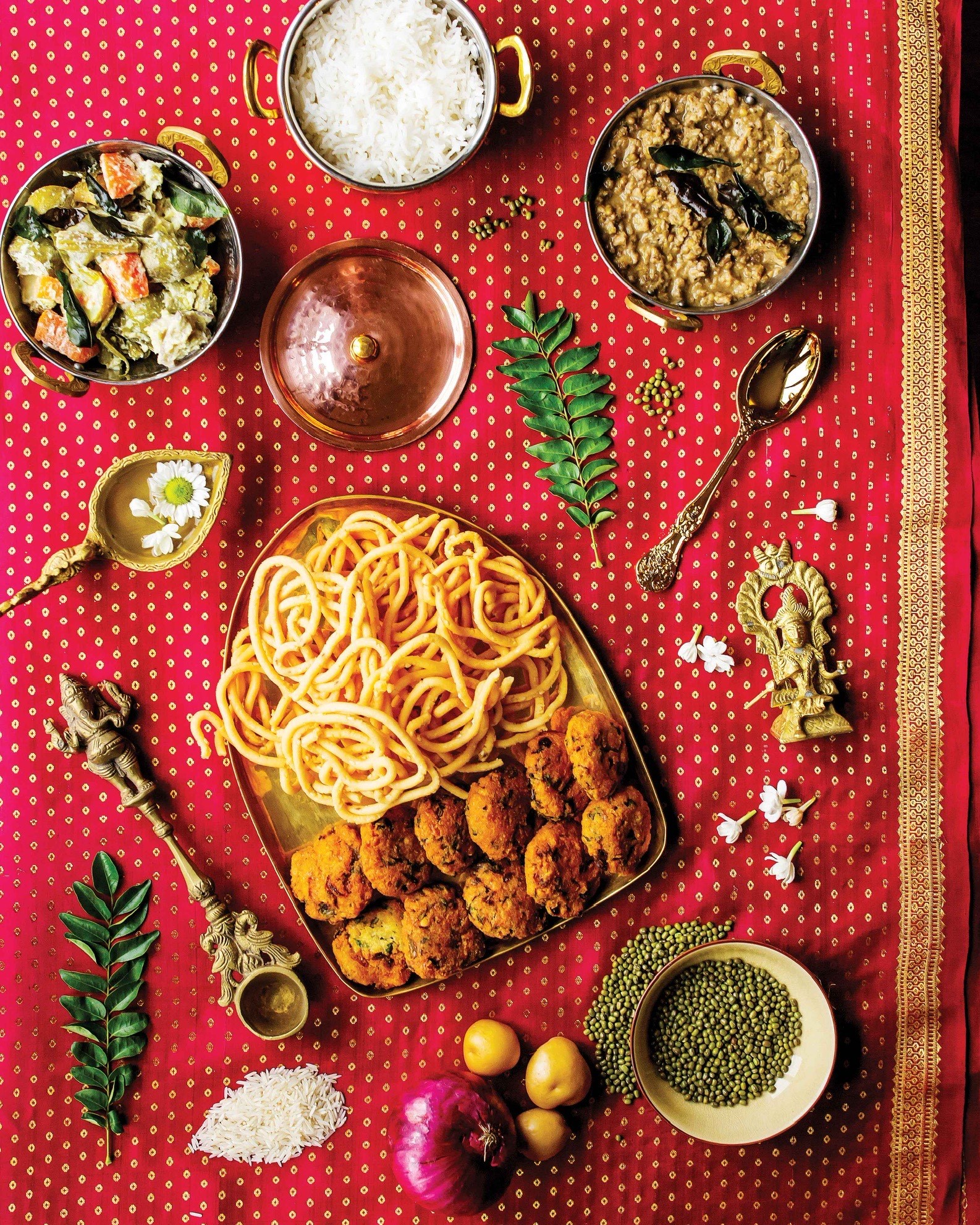 Several dishes in the book including murukku (crispy snack), vada (a savoury fried snack), avial (coconut curry with vegetables), basmati rice, and dhal (lentils) appear in gold dishes on a magenta and gold silk saree. Colourful ingredients, jasmine flowers, and a gold statue are found on the table setting amongst the dishes.