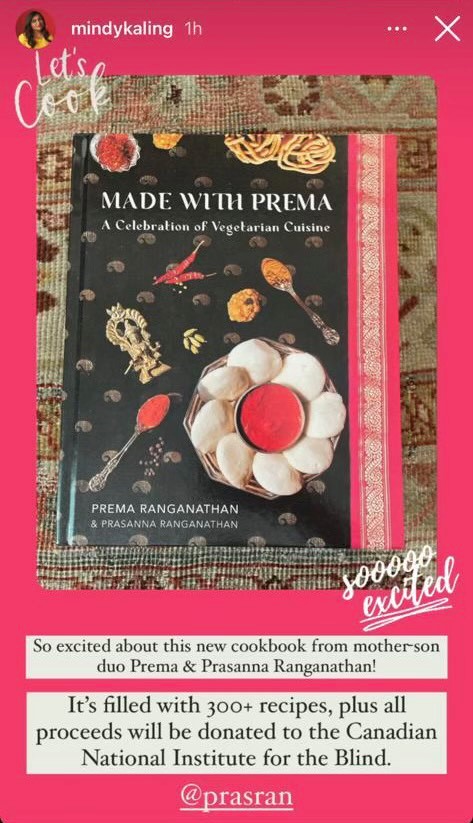 An image of Made with Prema appears on a magenta background with the profile photo and name of Mindy Kaling in the top left corner above the following text: “So excited about this new cookbook from mother-son duo Prema and Prasanna Ranganathan. It’s filled with 300+ recipes, plus all proceeds will be donated to the Canadian National Institute for the Blind.”