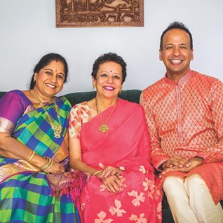 Prema, a South Asian woman with curly hair, wears a pink saree and sits next to two people – her friend Chamundi Eswari Selvaraj, a South Asian woman with long hair, wearing a green and blue plaid saree and her son Prasanna, a South Asian man with short hair, who is wearing a pink kurta. They are all seated on a green couch