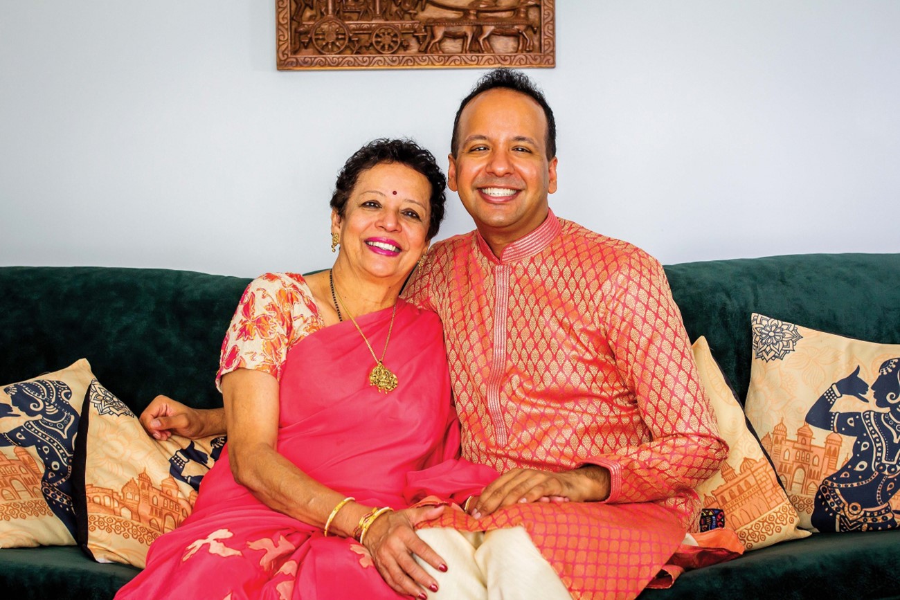 Prema, a South Asian woman with curly hair, wears a pink saree and sits next to her son Prasanna, a South Asian man with short hair, who is wearing a pink kurta. They are both seated on a green couch with yellow printed throw pillows.