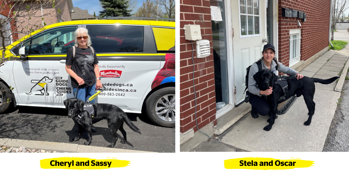 Left: Cheryl and Sassy. Cheryl stands in an outdoor driveway with Sassy, a black lab in harness. Behind Cheryl is a CNIB Guide Dogs branded vehicle. Right: Stela and Oscar. Outside an apartment building, Stela kneels on the ground next to her guide dog, Oscar. Stela smiles and has her arm around Oscar, a black lab in harness.