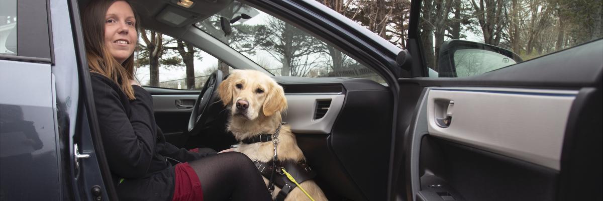 “When Maple walked through my front door for the very first time, I was beyond happy – she’s such a sweet dog. She loves to play, but it's time to get serious when the harness goes on – she is 100 per cent ready to work. She’s like a sergeant when the harness goes on – she doesn’t listen to anyone but me. If I tell her to stay while I go upstairs to get something I forgot, she’s in that exact spot when I return. When she’s out of harness, she’s fun, loving, cuddly… such a happy dog. She’s given me so much more independence. I can now follow my boyfriend in the grocery store rather than holding onto his arm, and I feel more comfortable going out for walks in my neighborhood. People often stop me and ask questions about what it’s like to have a guide dog and how she has made a difference in my life. I’ve also had several people ask me about the training that Maple has received. Respecting the guide dog partnership is so important – if the handler tells you not to touch or talk to their dog, please listen to them. When a dog is distracted, a handler's safety could be at risk. Handlers know their dogs are cute, and we know many people would love to pet and play with our guide dogs, but harness on means hands off – it's time to work, not play! I’ve heard many handlers talk about the access issues they've encountered while going to places with their guide dog. Honestly, I haven't had issues, but I hope that's the reality for every guide dog handler in the near future. Guide dogs belong everywhere. Looking back, I never thought in a million years that I’d be able to trust an animal as much as I trust Maple; but I love her and I know she’ll never lead me into harm’s way.” -Kelly