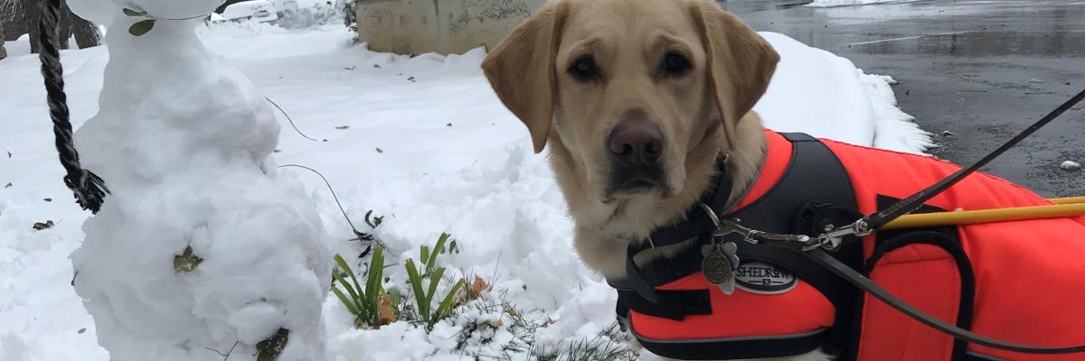 Snow accumulation can be a barrier to travel in winter. Snow-covered sidewalks, hidden curb edges and snowbanks blocking the way, can make guiding work more challenging for dogs. Knowing where to stop at intersections and negotiating the most appropriate line of travel when crossing can be more difficult, but with practice and reinforcement, your guide dog should be able to negotiate these situations effectively.