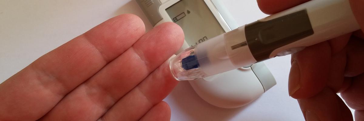 A woman checks her blood glucose level by poking her finger and using a blood glucose meter.