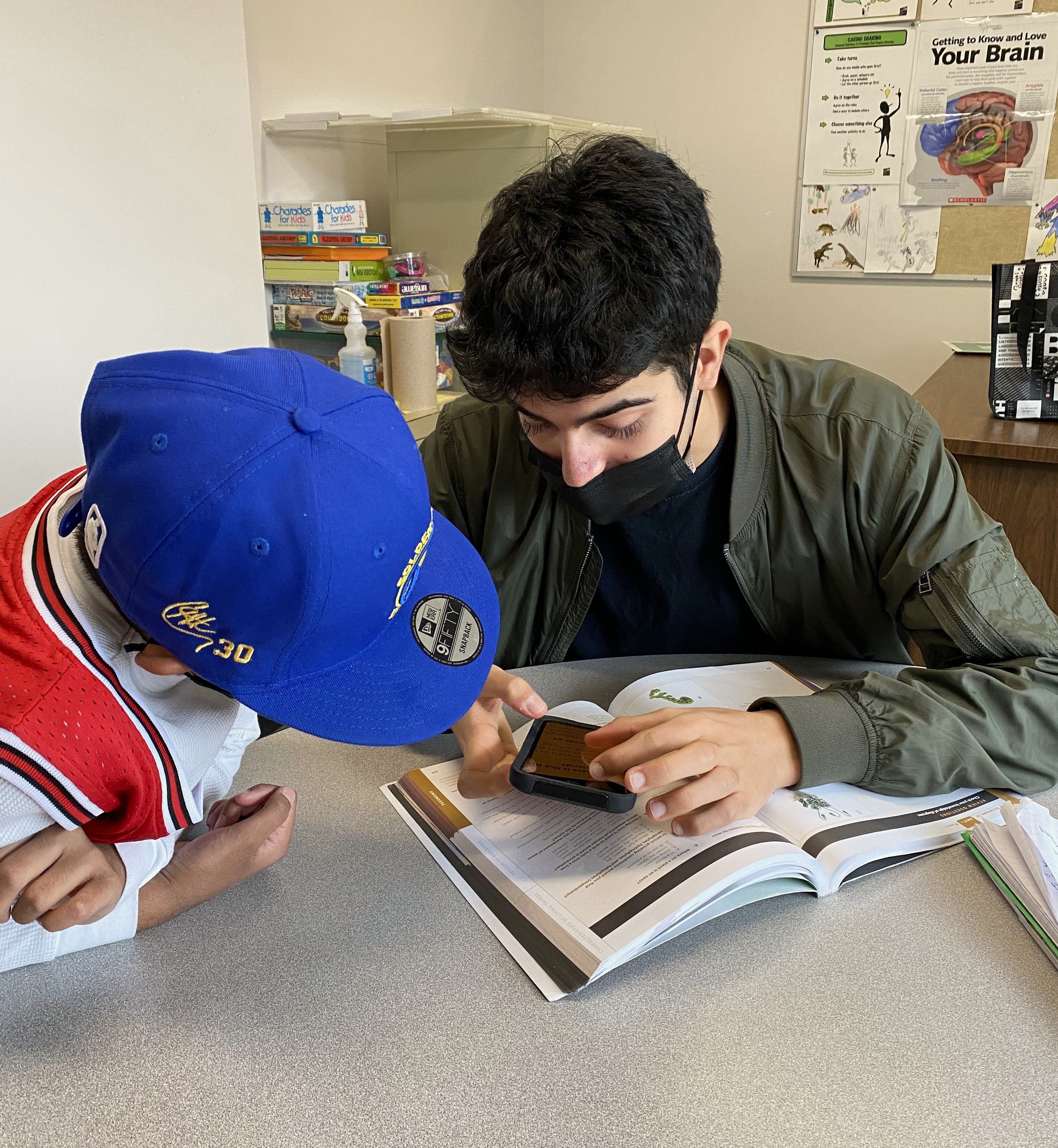 In a classroom, Aidan sits with a young student and shows him the magnification features on his iPhone. Aidan is holding his iPhone over a textbook.  The student intently leans-in for the demonstration.Aidan: I co-founded Inspired 2 Uplift (I2U) alongside two childhood friends during my sophomore year of high school. We identified a significant social barrier facing students with disabilities in connecting with the broader school community, and we knew it was essential to bridge this gap. In short, Inspired 2 Uplift's mission is two-fold: we provide support to youth with disabilities through our buddy program in high schools across Canada and the US while also educating and raising awareness about disability-related issues among the younger through our Events and Advocacy Sector. Last year alone, I2U has raised over $1,000 for our programs and has amassed a team of over 60 student volunteers. For me, the goal is to make Inspired 2 Uplift a globally recognized non-profit organization that supports youth with disabilities all over the world.