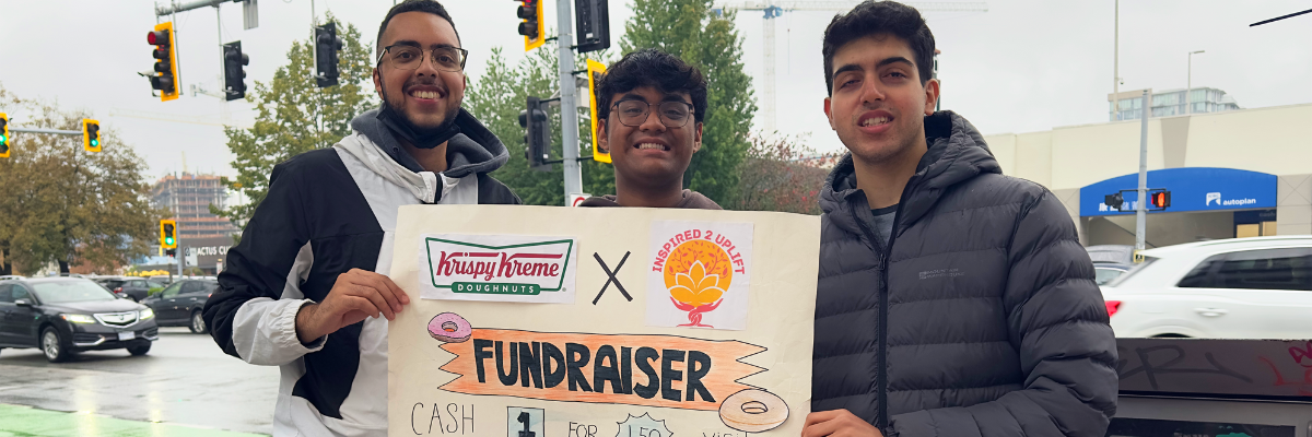 Aidan and his friends fundraise for Inspired 2 Uplift. They are standing outdoors at a table that is filed with donuts. The trio hold a sign that reads “Krispy Kreme Donuts – Inspired 2 Uplift Fundraiser.”