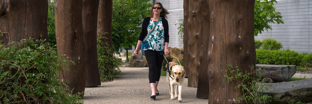 Larissa and their guide dog, a yellow lab named Piper, walk along an outdoor pathway at the Wayne Gretzky Sports Centre.