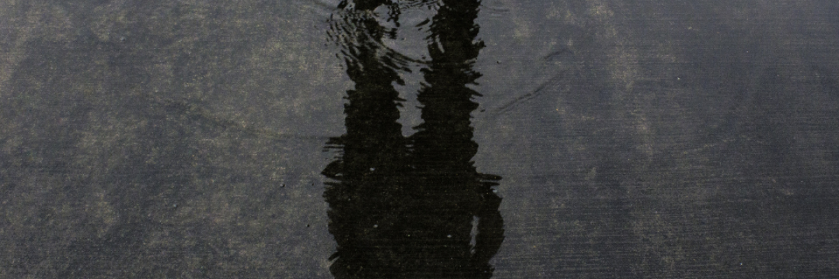 A young man stands peering over a puddle. Their running shoes appear at the top of the image. In the puddle is a soft reflection of their silhouette.