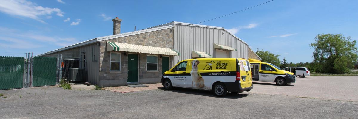 Exterior of Canine Campus in Carlton Place. Three CNIB Guide Dogs vans parked out front, trees and blue skies in the background.