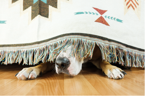 A dog hiding under a blanket on the floor peeks his nose and paws out from underneath.In this case, you can introduce your puppy to sudden noises by lightly tapping a metal pot with a spoon or playing audio clips of firework displays at a low volume (YouTube is a great resource for firework sounds). Do this while the puppy is eating, chewing a favourite bone, training, or having playtime in the house or yard. The key is to pair these sounds with something the puppy loves, so the puppy creates a positive association and reaction to these sounds. You can also play and make these sounds while the puppy is sleeping, so it becomes a part of regular background noise to them.