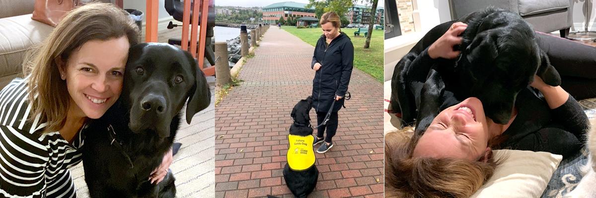 A collage of three photographs. Left: Denise crouching next to Harlow with her arm around him. Center: Denise doing training with Harlow, who is sitting and wearing his Future Guide Dog vest, on the waterfront in Halifax. Right: Denise lying on the floor laughing while Harlow gives her a cuddle