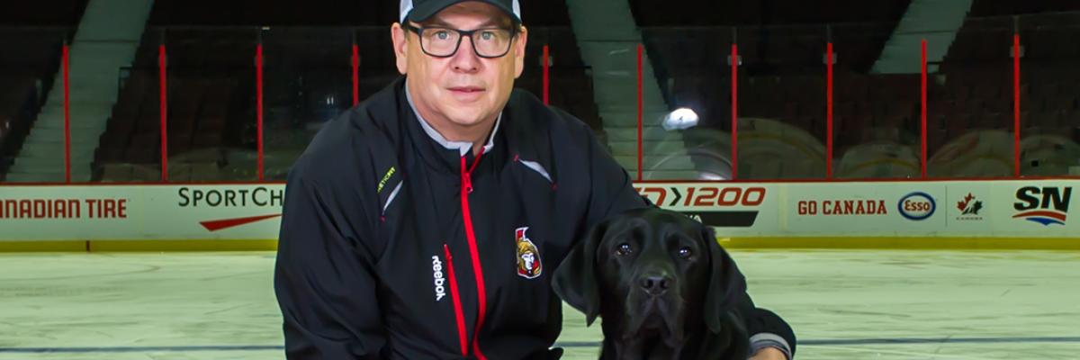 In September 2020, Rookie started his career as a CNIB Guide Dog when he was matched with Shelley Adams in Halifax. With shooting pucks and cheering fans every step of the way, Mark and the Ottawa Sens set him up for success. Thanks, Mark!