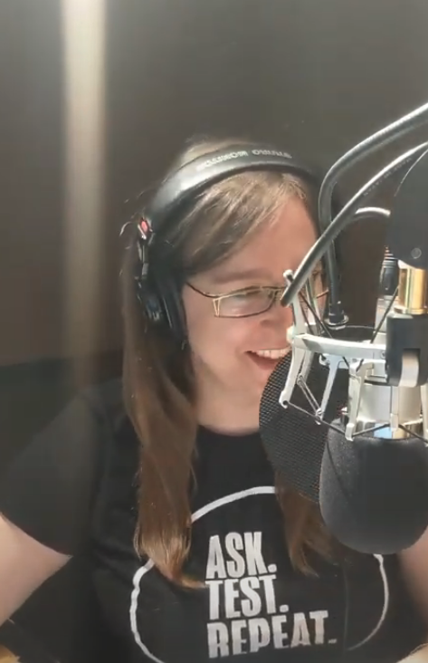 Dana sits in a recording booth. She is wearing big headphones and speaking into a microphone.