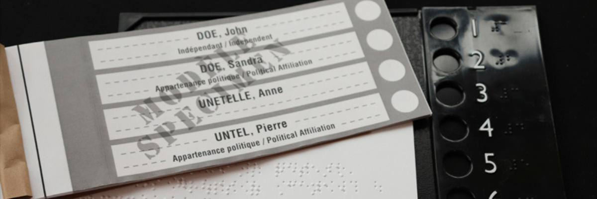 A sample election ballot sits on top of a braille document and next to a ballot template with braille numbering and cut outs for voter use.