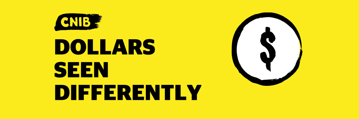 CNIB Dollars Seen Differently podcast logo. On a yellow backdrop, is the text: CNIB Dollars Seen Differently. To the right of the text there is a white circular icon with a black dollar sign inside of it.