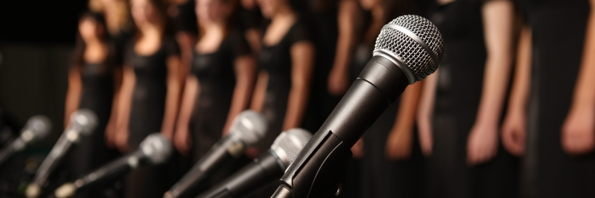 Photo of a number of microphones lined up with a group of women in black dresses in the background.