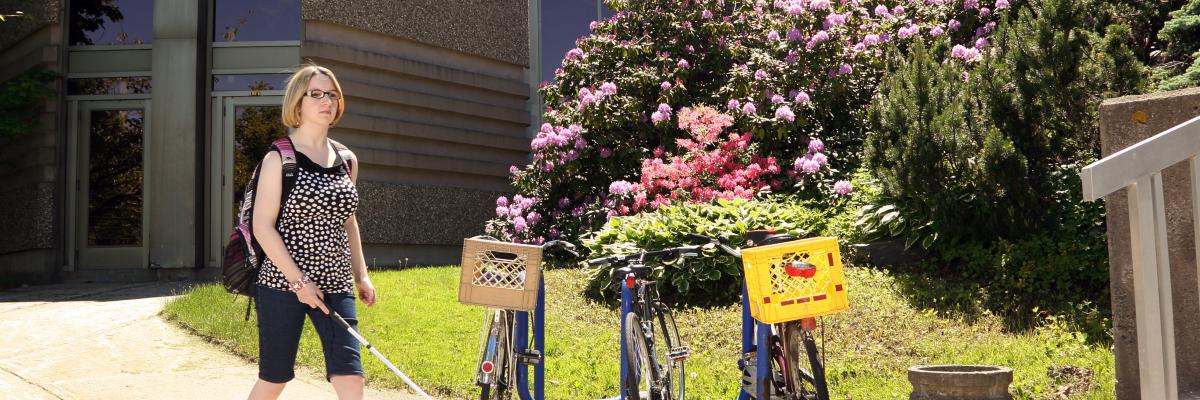Young woman walking with her white cane on a sidewalk passing by three parked bicycles.