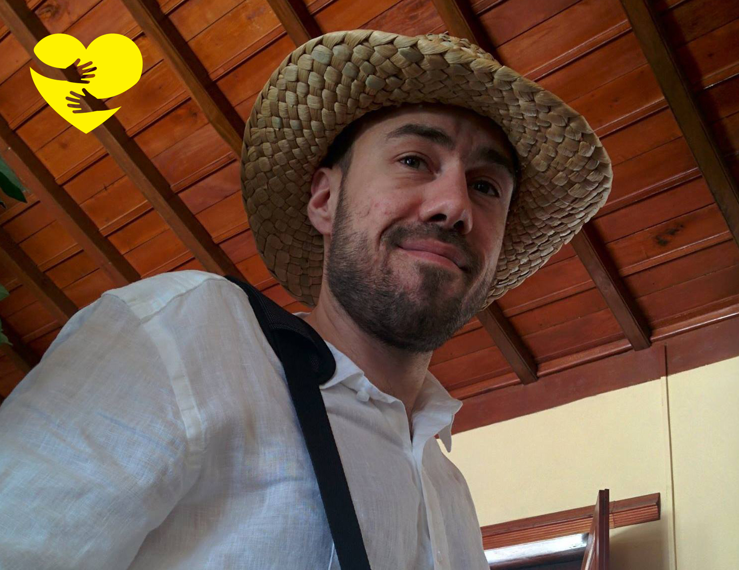 [Kevin, looking down at the camera with a smile while wearing a straw hat. A graphic of arms hugging a yellow cartoon heart can be seen in the top-left corner of the photo.]