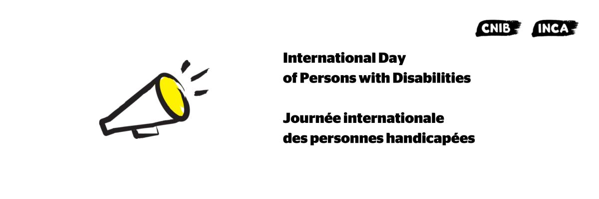 An illustration of a megaphone outlined in a black paintbrush style design with yellow accents. Text: International day of Persons with Disabilities. Journée internationale des personnes handicapée.