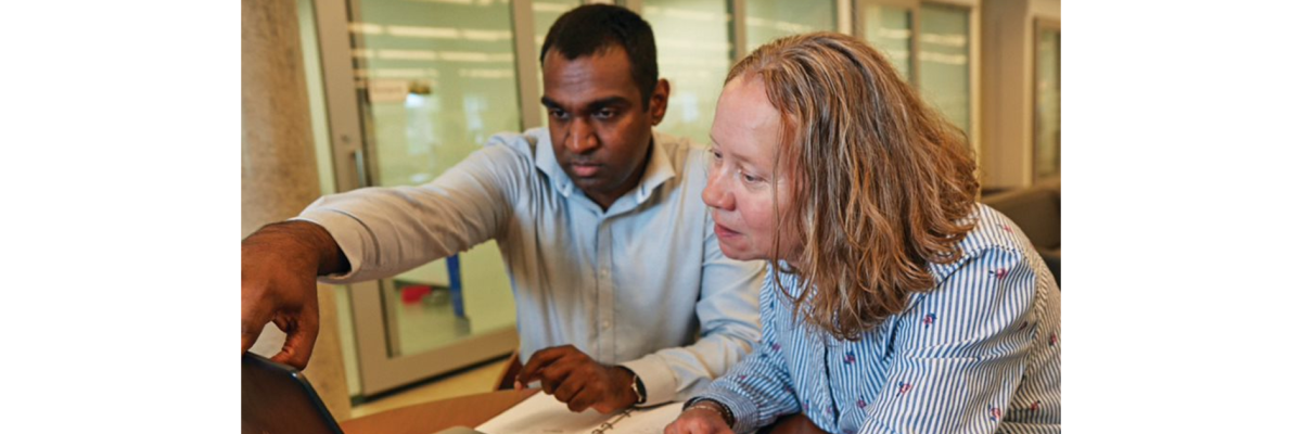 A man and a woman sitting at a desk looking a laptop screen