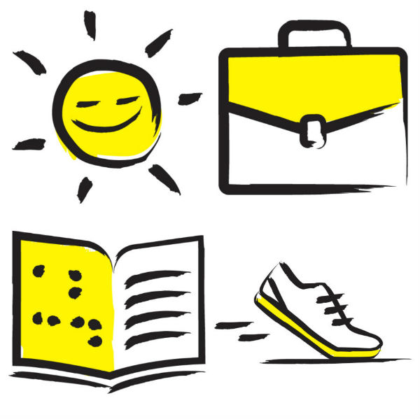 Yellow and black icons including a sun, a briefcase, a shoe and a braille book Our look