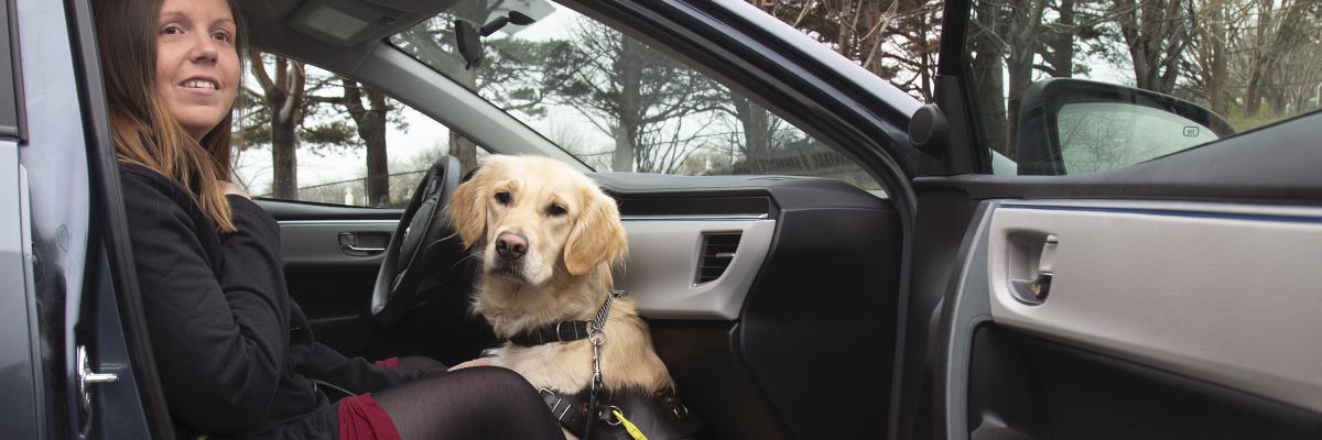 A woman sitting in the front passenger seat of a taxi and her guide dog, a golden retriever, sits at her feet between her legs.