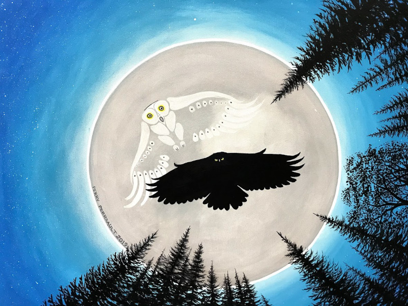A painting by Perry Perrault of two owls, one black one white, flying high in the centre of a full moon in a blue night sky. Forest trees surround the moon