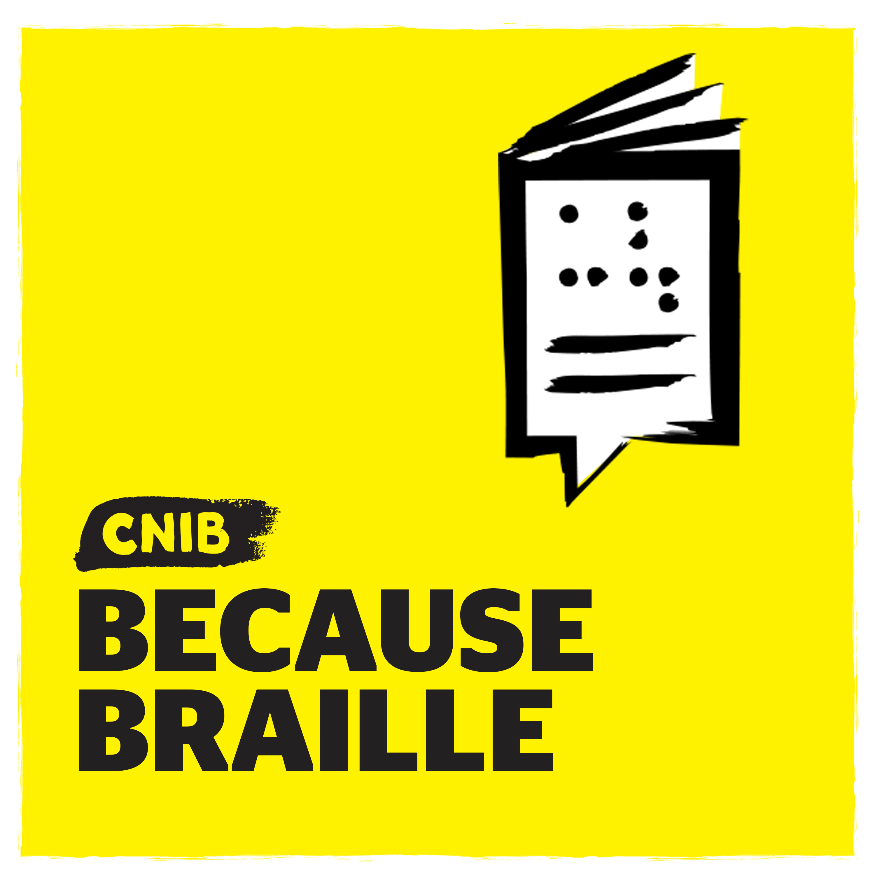 CNIB Because Braille logo. An illustration of a braille book with a speech bubble icon on yellow. Join host Rhonda Underhill-Gray as she talks to people involved in the Canadian world of braille. Readers, writers, transcribers and more!