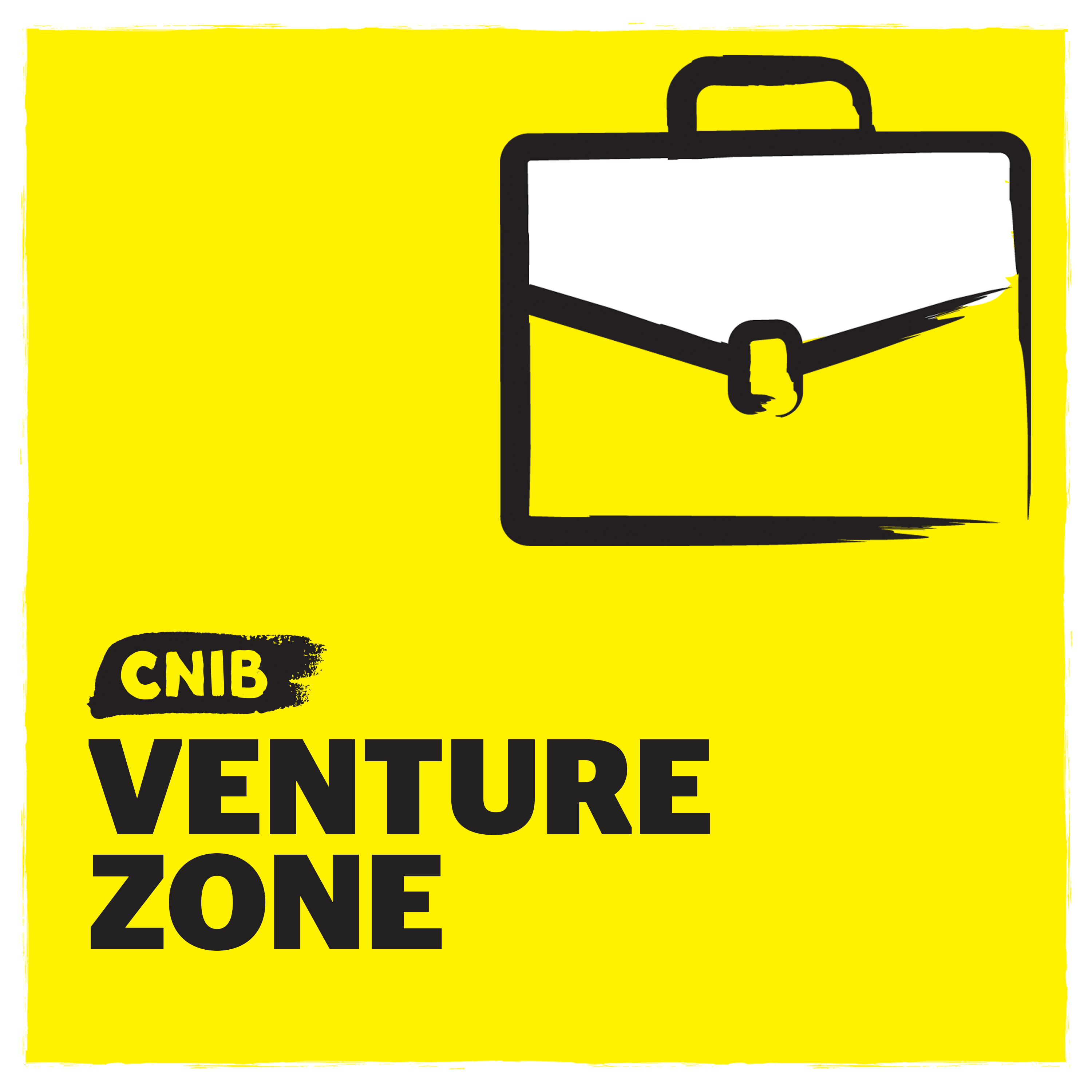 CNIB Venture Zone logo. An illustration of a briefcase on a yellow background. The 'Venture Zone' Podcast showcases dynamic entrepreneurs who are blind or partially sighted and curates expert advice about successfully running a business.