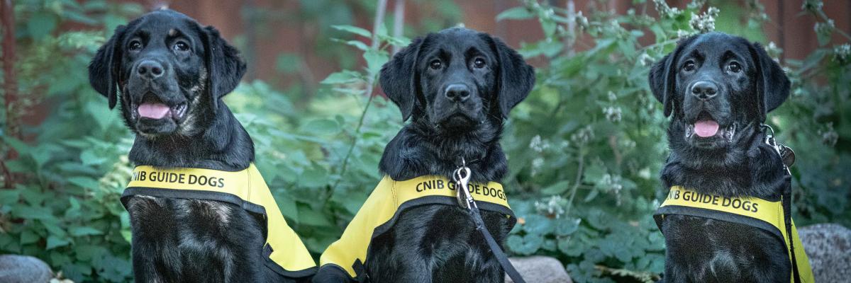 Three CNIB Guide Dogs sitting in the grass staring at the camera.