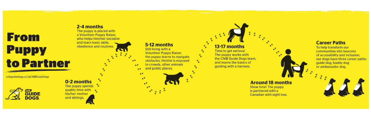 2-4 months: Puppies are placed with carefully selected volunteer puppy raisers. Supported by CNIB Guide Dogs staff, they play a pivotal role in raising and socializing the puppy to become a guide dog. This is the time puppies learn basic skills, obedience commands and feeding routines
