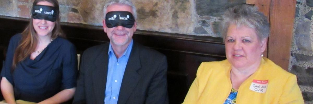 Cindy sits with two Dining in the Dark guests, who are wearing blindfolds.